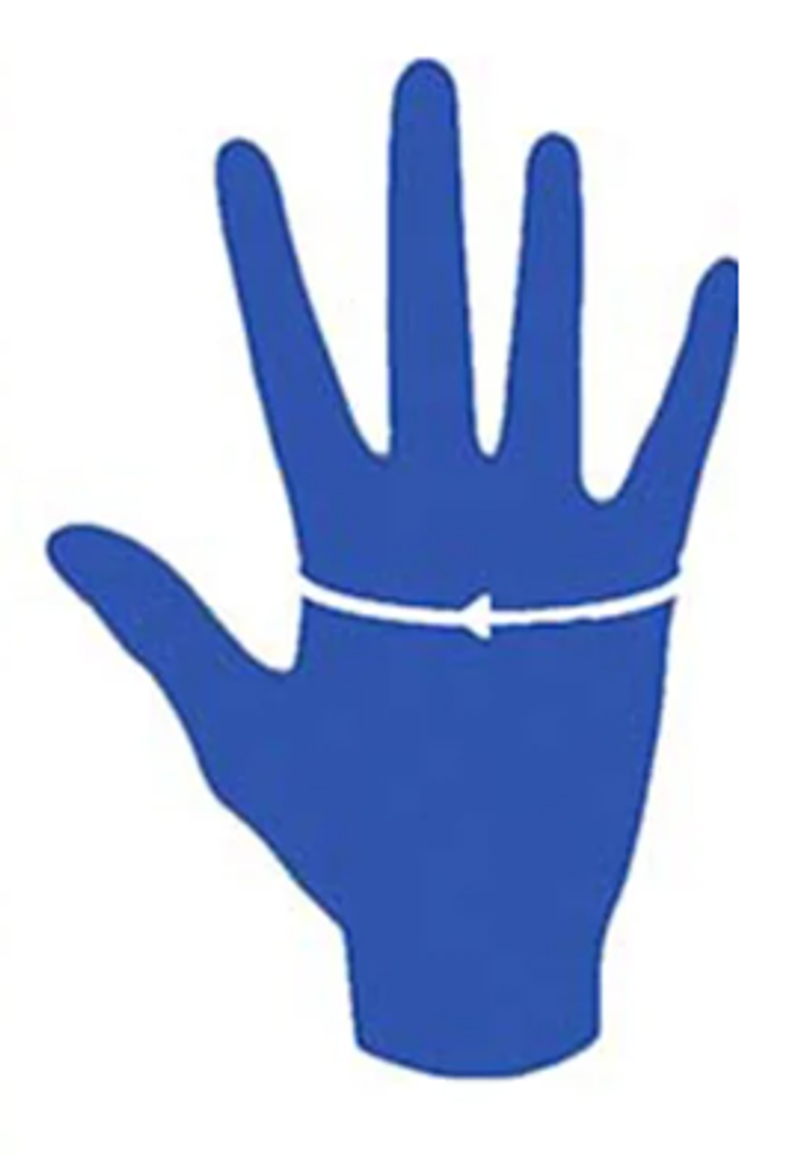 För att få rätt storlek: använd ett måttband och mät omkretsen runt handen precis nedanför knogarna, men ej runt tummen.
