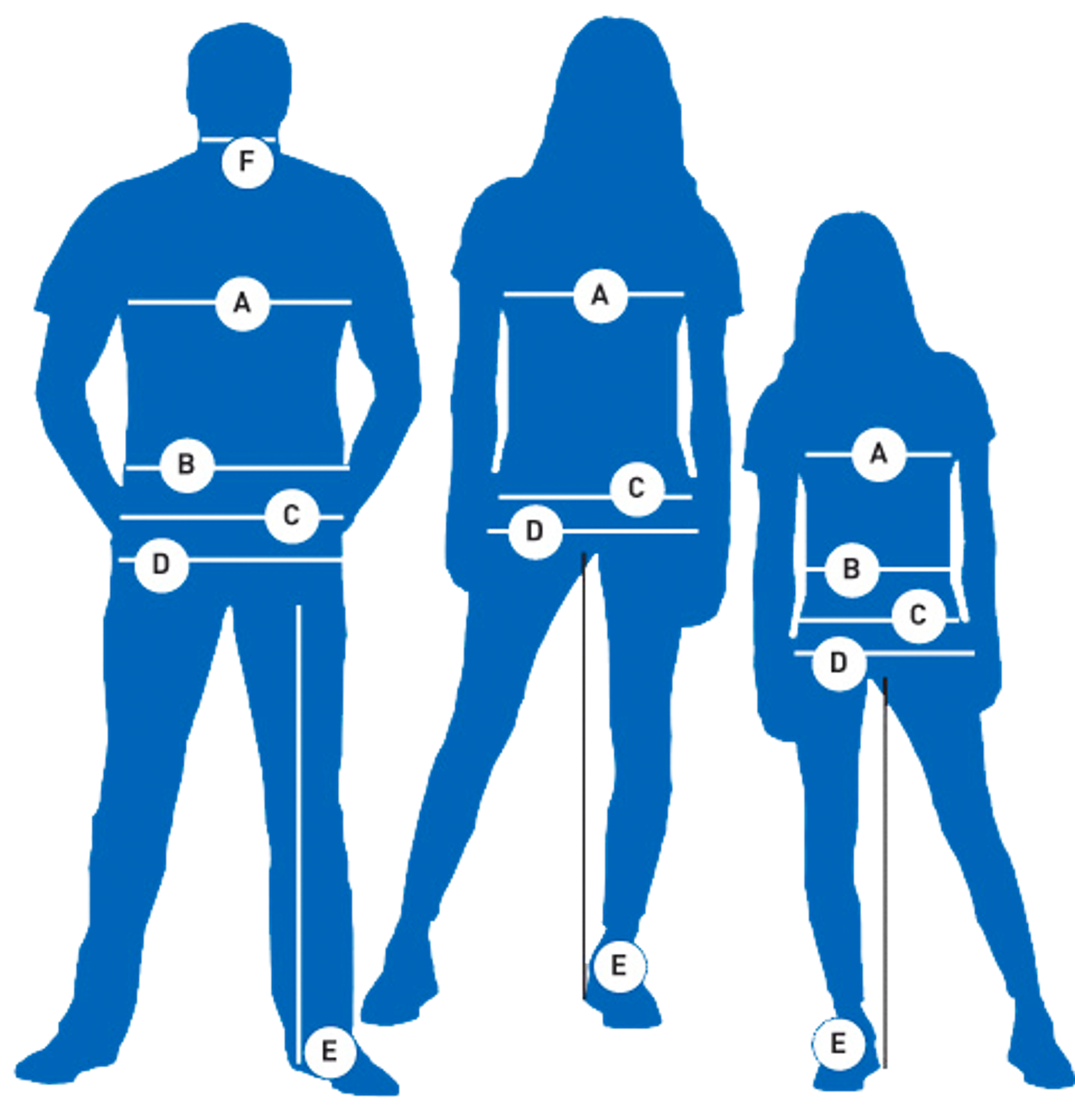 A. Bröst B. Midja C. Höfter D. Stuss E. Insida ben F. Nackbredd